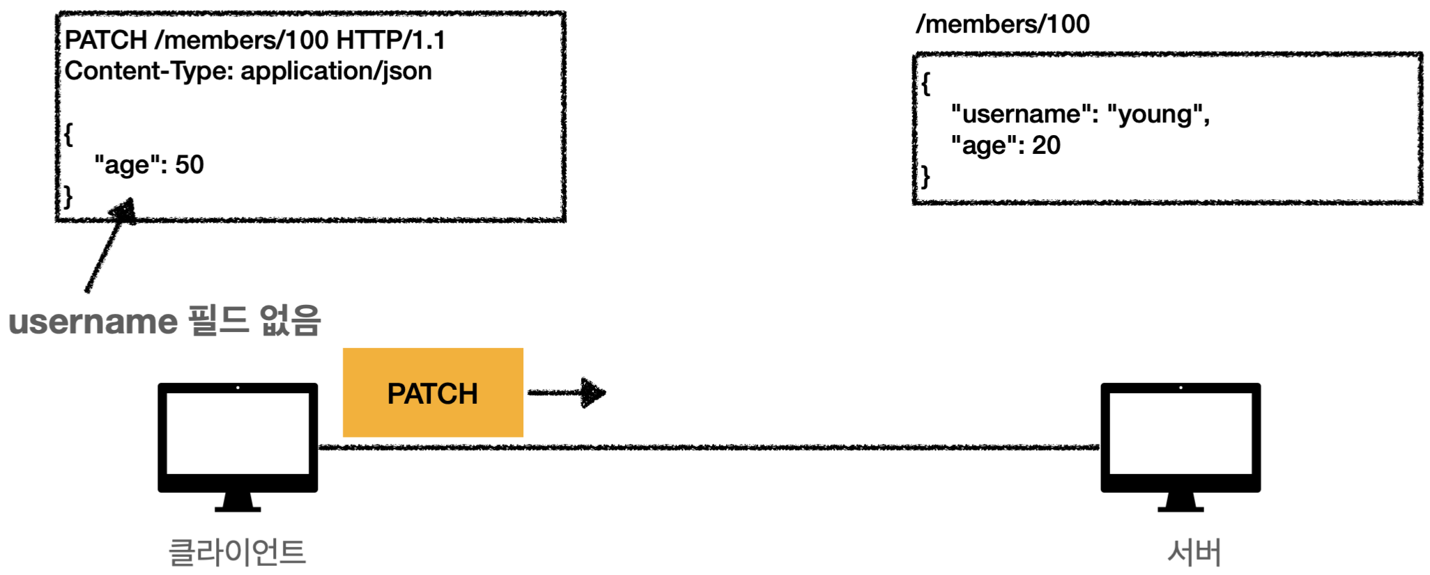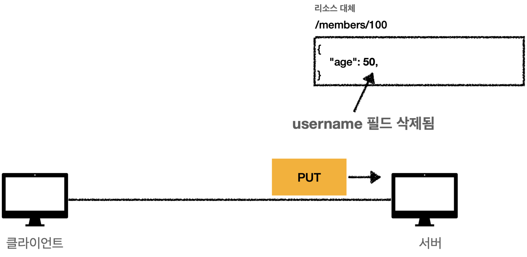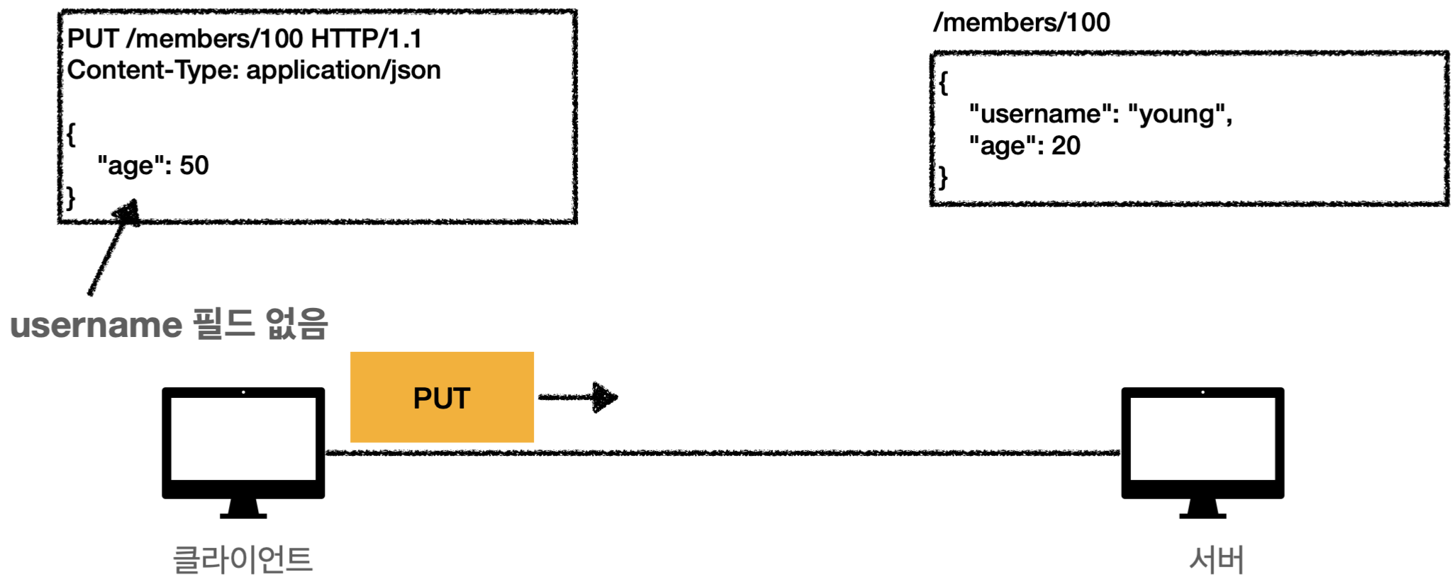 PUT은 리소스를 완전히 대체하기 때문에 넘겨준 age만 저장되고 username 필드가 삭제되어 버린다.