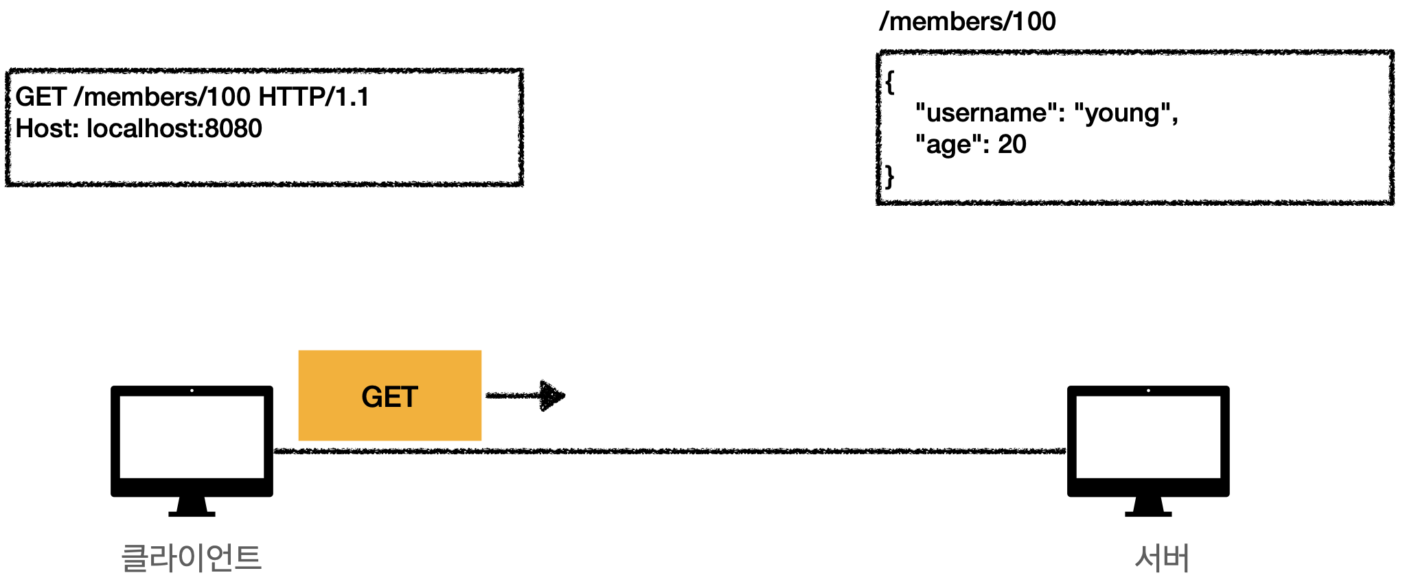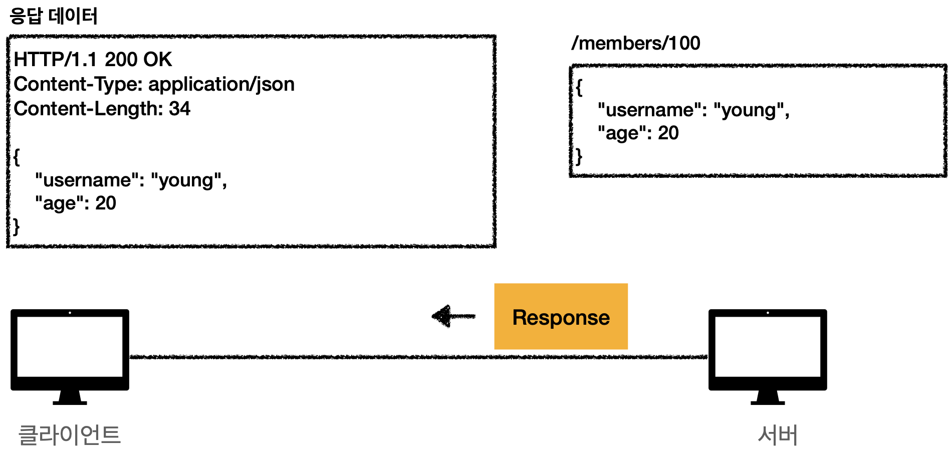 클라이언트가 /members/100의 데이터를 달라는 요청을 보냈다. 서버는 이를 확인하고 내부의 데이터베이스를 조회해 오른쪽과 같은 JSON 메시지를 이용해 응답메시지를 만들어 클라이언트에 전송한다.
