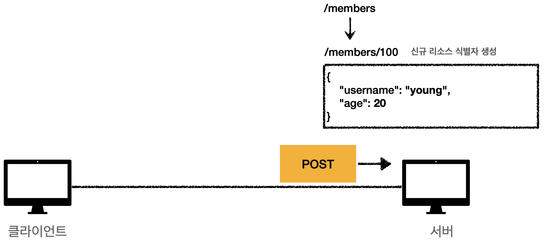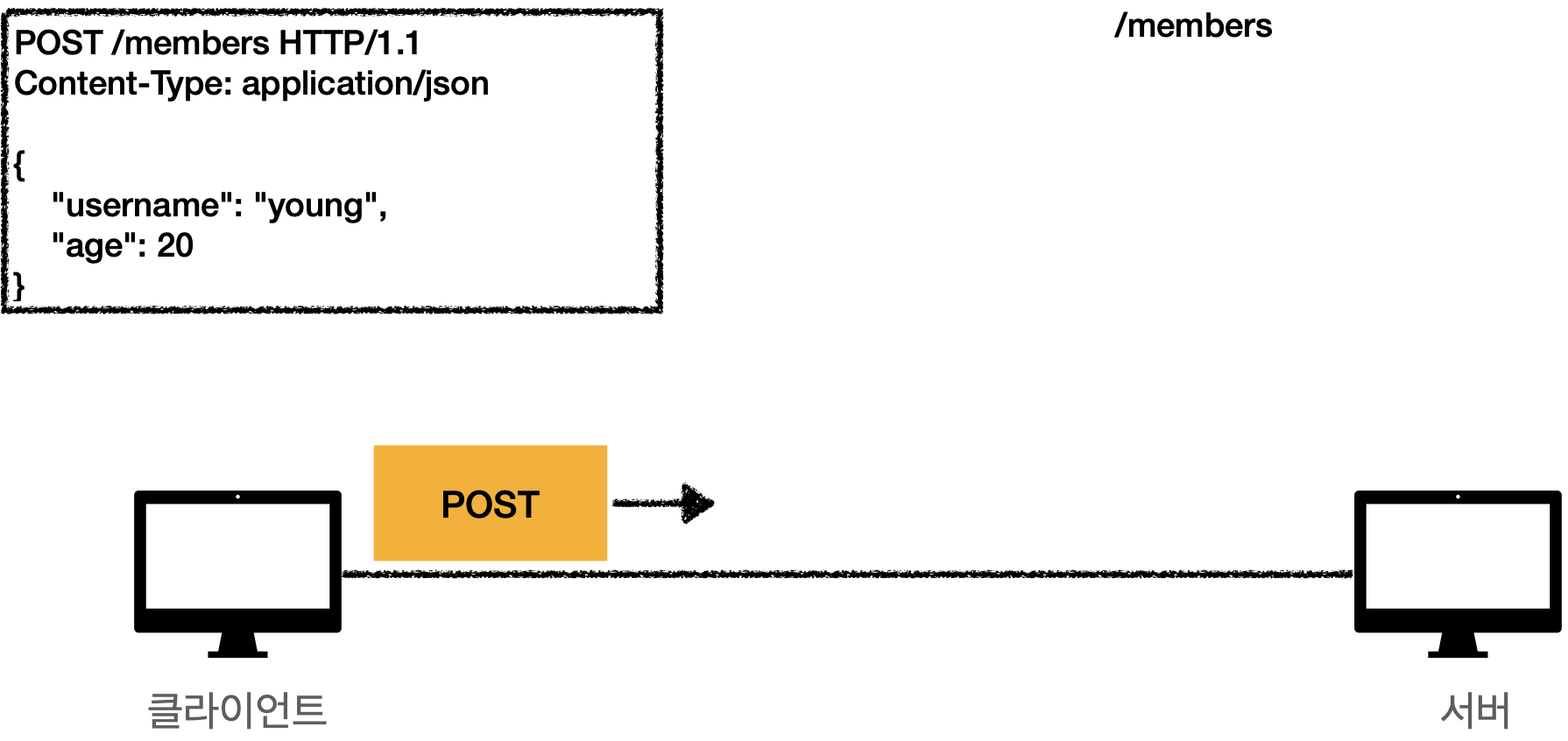 클라이언트는 POST를 통해 /members라는 곳에 리소스를 전달한다. 이때 서버와 클라이언트는 /members에 POST로 전송하면 그 데이터는 서버가 저장을 하거나 내부 프로세스를 처리하는 데 사용할 것이라는 것을 미리 약속해 놓는다. 지금은 신규로 등록을 하는 것이라 가정하자.