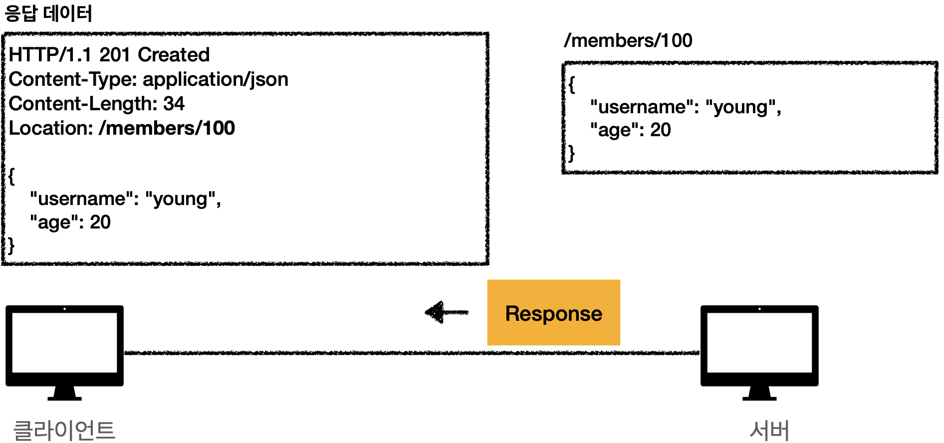 서버는 이를 열어 확인해 보고 POST에 /members로 왔기 때문에 데이터베이스에 등록을 하고 신규 리소스 식별자를 생성하고 응답 메시지를 클라이언트에게 보내준다.