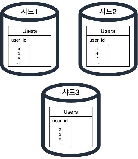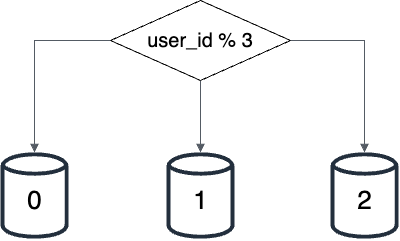 μλμ κ·Έλ¦Όμ μ€λλ‘ λΆν λ λ°μ΄ν°λ² μ΄μ€μ μμ΄λ€. μ¬μ©μ λ°μ΄ν°λ₯Ό μ΄λ μ€λμ λ£μμ§λ μ¬μ©μ IDμ λ°λΌ μ νλ€. μ΄ μμμμλ user_id % 3μ ν΄μ ν¨μλ‘ μ¬μ©νμ¬ λ°μ΄ν°κ° 보κ΄λλ μ€λλ₯Ό μ νλ€.