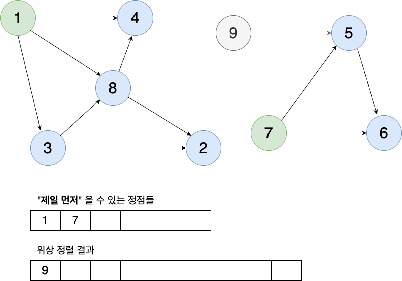 9가 삭제됨으로 인해 새롭게 "제일 먼저" 올 수 있는 정점이 있는지를 보자. 5번의 경우, Indegree가 7번으로 존재하기 때문에 불가능하다. 따라서 그냥 넘어가자!