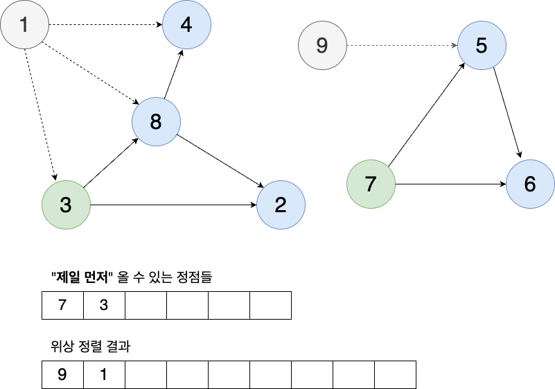 1번을 꺼내고 그래프에서 삭제시켰다. 그렇다면 1번에서 갈 수 있는 3, 8, 4번에 대한 정점도 사라지게 될 것이다. 이렇게 되면 3번 정점은 들어오는 정점이 사라진다. 즉, Indegree가 0이 된다. 3번 정점은 현재 남아있는 2, 4, 5, 6, 7, 8번 정점에 대해 가장 앞에 올 수 있는 후보가 되기 때문에 "제일 먼저" 올 수 있는 정점들에 추가시켜 준다.