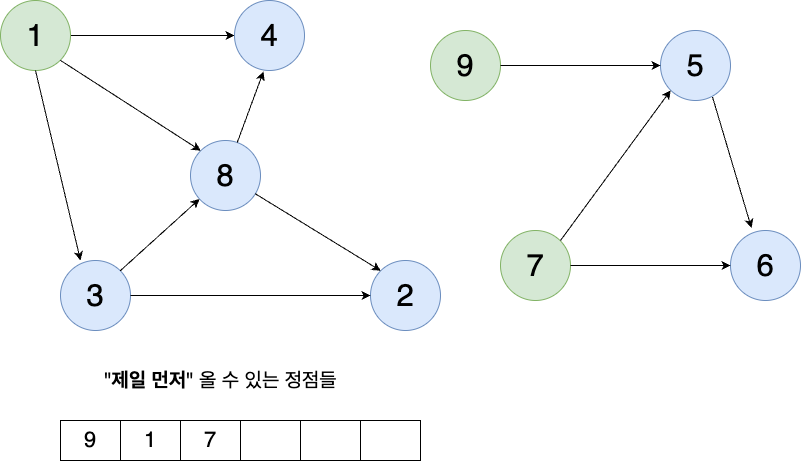 위상 정렬을 적용하는 가장 쉬운 방법은 "제일 먼저 올 수 있는 정점은?" 을 생각해보는 것이다.