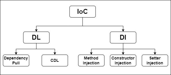 일반적으로 IoC는 의존성 주입(DI)과 의존성 룩업(DL)의 두 가지 하위분류로 나눌 수 있습니다. 이들 하위분류는 다시 구체적인 IoC 서비스 구현체로 나뉩니다. 이 분류체계를 그림으로 간단히 나타내면 다음과 같습니다.
