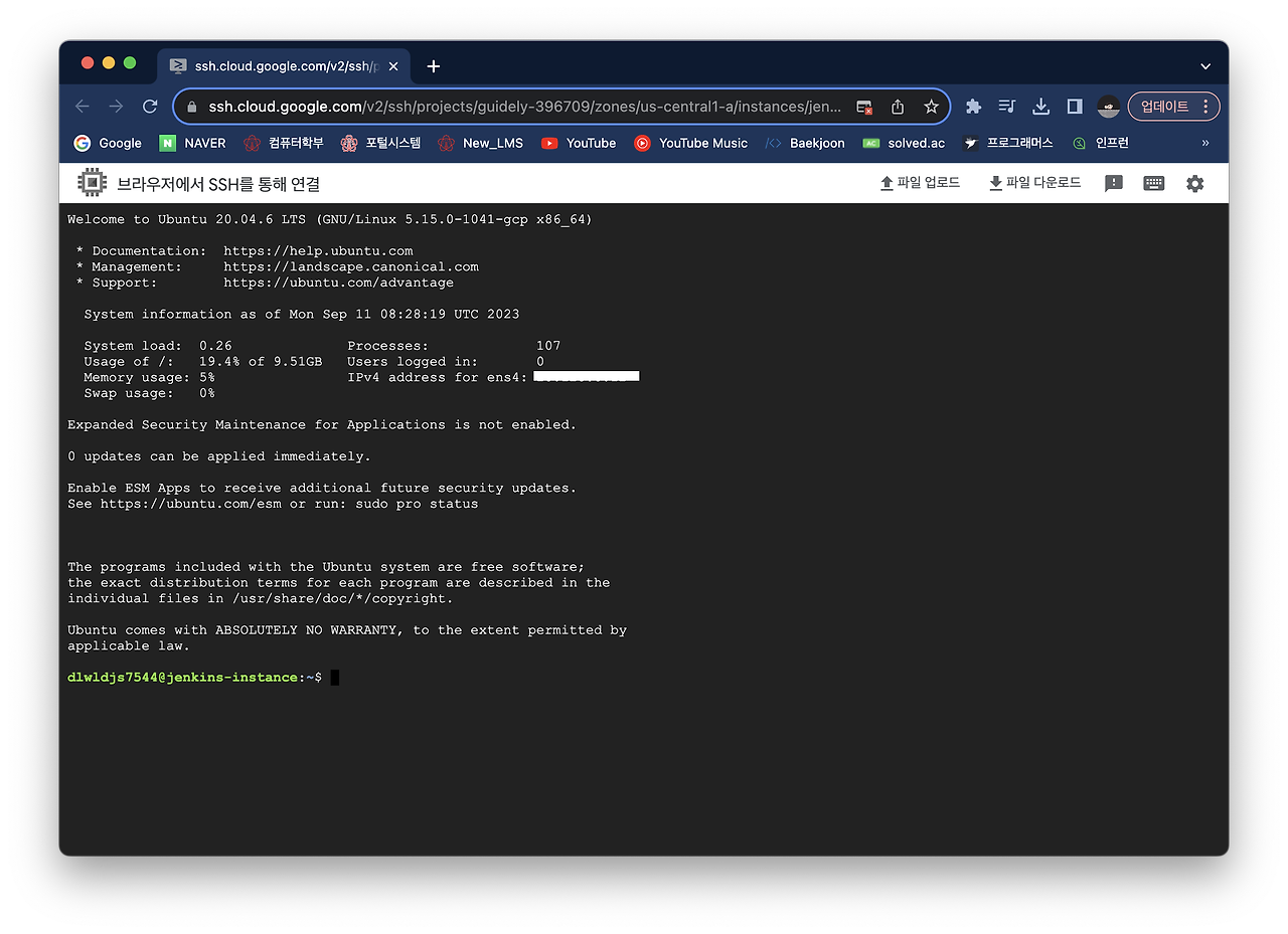 위 사진과 같이 초기 비밀번호를 입력하는 창이 나올 것입니다. 이를 확인하기 위해 다시 GCP shell 화면으로 돌아가서 Jenkins 컨테이너에 접속해봅시다. 아래 명령어를 통해 컨테이너에 접속합니다.