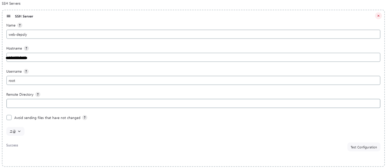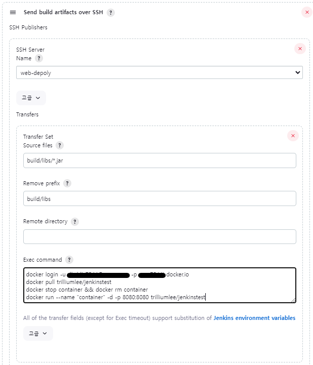 그 바로 아래, 빌드 후 조치 탭에서 Send build artifacts over SSH를 선택해줍니다. 그리고 다음과 같이 작성합시다.