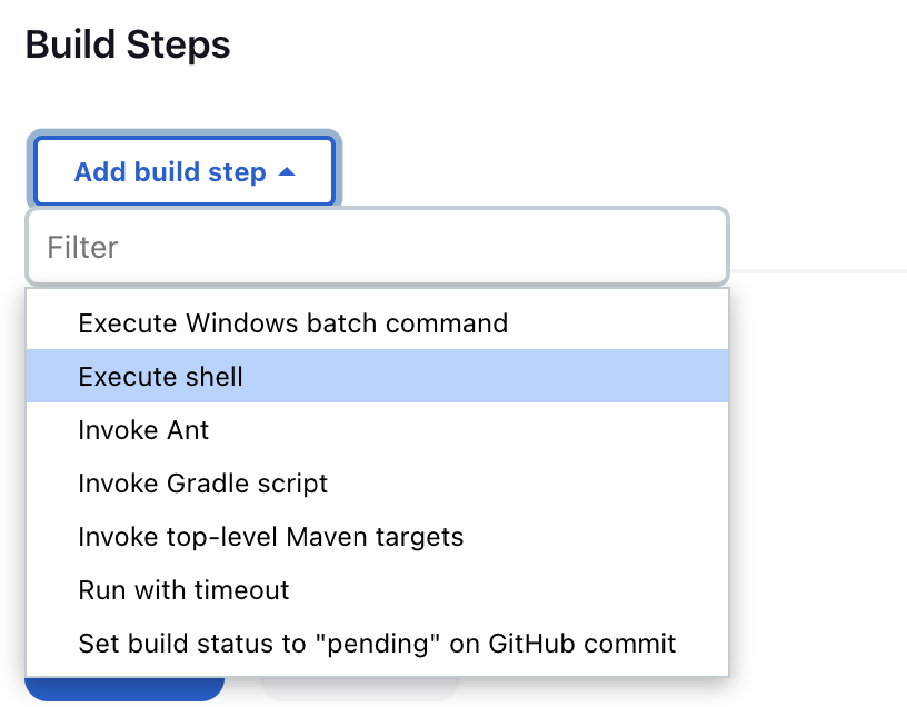 그 다음으로 Build Steps 탭에서 어떤 방식으로 빌드를 수행할지 설정할 수 있는데 shell을 통한 방법을 선택하겠습니다.