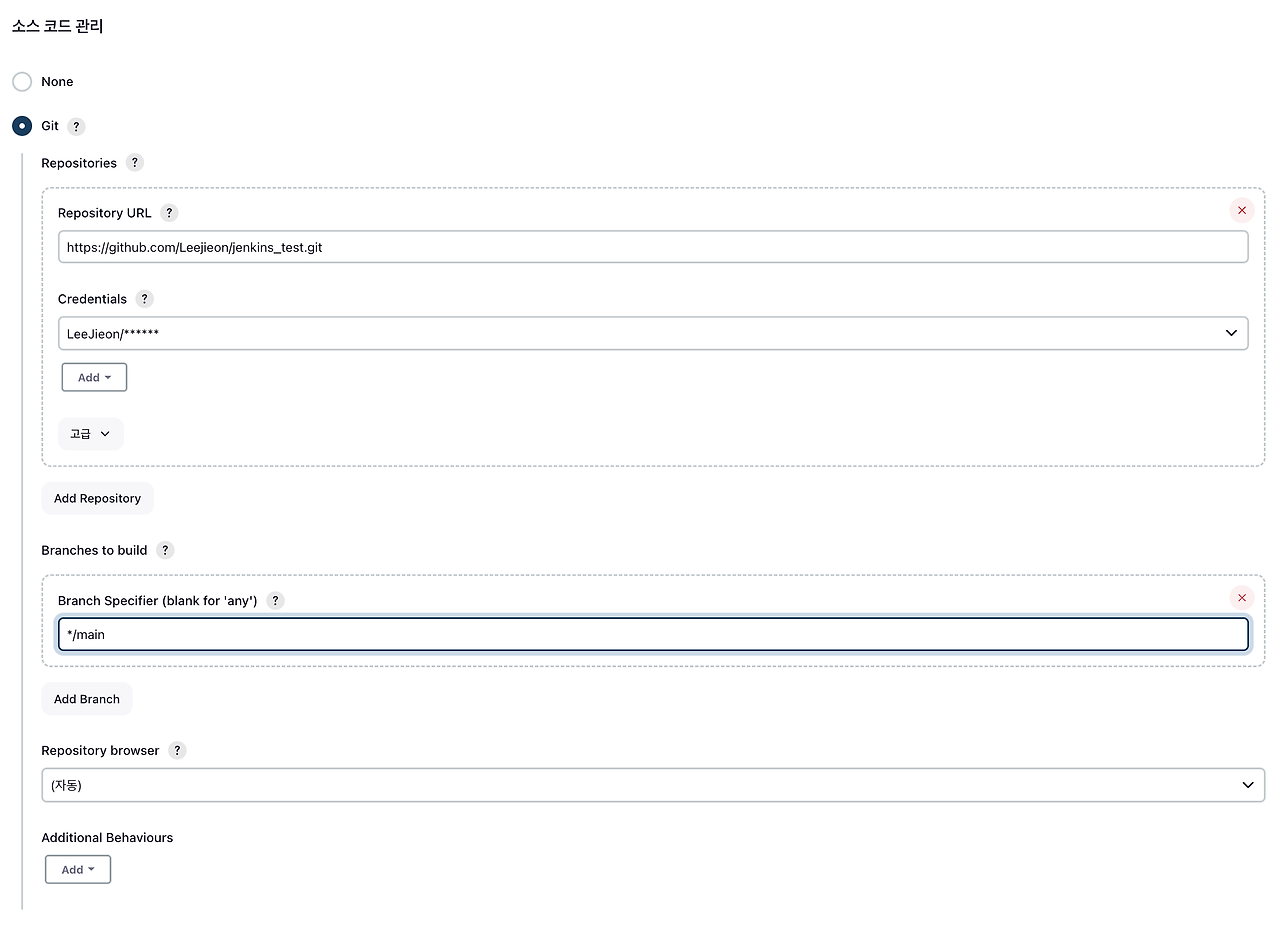 Repository URL은 위와 같은 주소이고, Credentials를 설정해줄껀데, 이는 Jenkins와 Github 사이에 데이터를 주고 받을 때의 인증 방식을 의미합니다. SSH-key 인증 방식을 많이 이용하지만, 테스트를 위해 Github 계정 인증 방식을 사용하겠습니다. 추후에 변경해주면 됩니다!