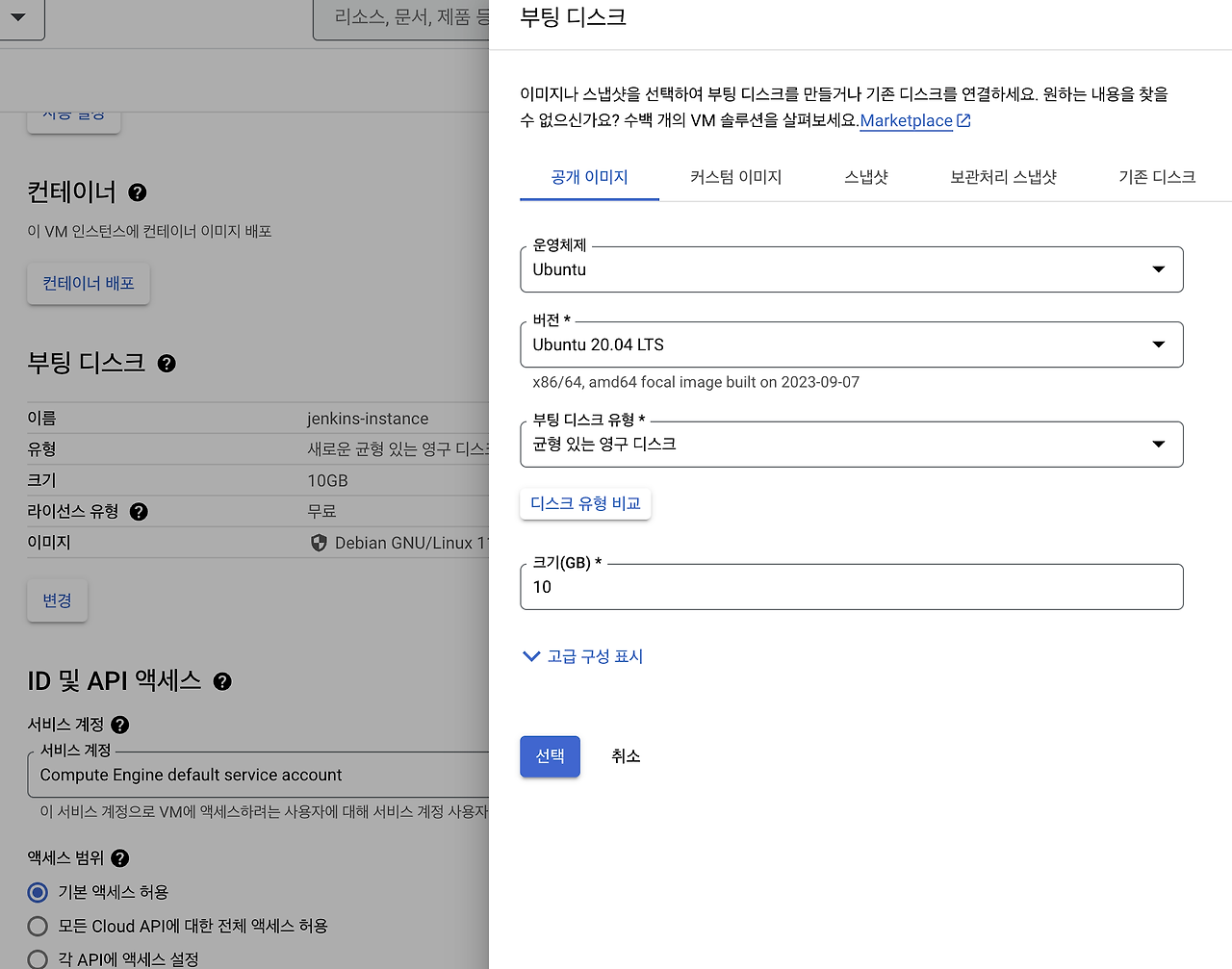 GCP → Compute Engine → VM 인스턴스로 들어가 상단의 `인스턴스 만들기`로 Jenkins를 위한 인스턴스를 생성합시다. 저는 부팅 디스크의 운영체제를 Ubuntu로 선택했습니다.
