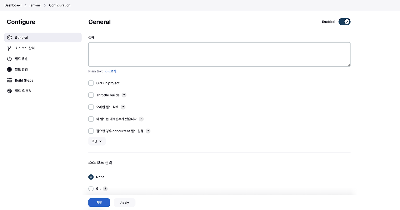 Jenkins 메인 화면에서 생성했던, Item(Freestyle Project)에 들어갑니다. 접속한 뒤, 왼쪽의 구성 탭을 클릭합니다.