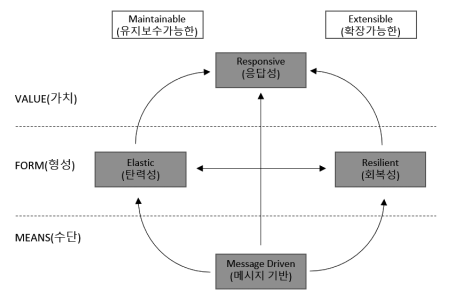 MEANS(방법) 영역은 리액티브 시스템에서 주요 통신 수단으로 무엇을 사용할 것인지 표현한 것입니다. 위 그림의 비동기 메시지 기반의 통신을 통해 구성요소들 간의 느슨한 결합, 격리성, 위치 투명성을 보장합니다.