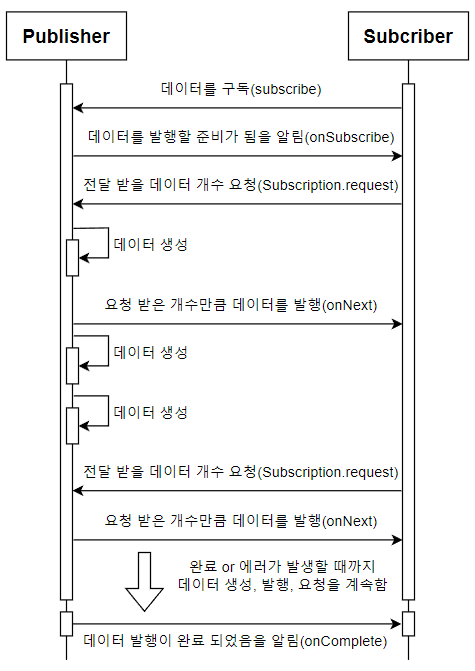 - 위의 과정을 반복하다가 Publisher가 모든 데이터를 통지하게 되면 마지막으로 데이터 전송이 완료되었음을 Subscriber에게 알립니다(`onComplete`). 만약 Publisher가 데이터를 처리하는 과정에서 에러가 발생하면 Subscriber에게 에러가 발생했음을 알립니다(`onError`).