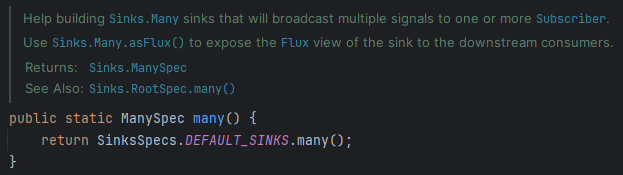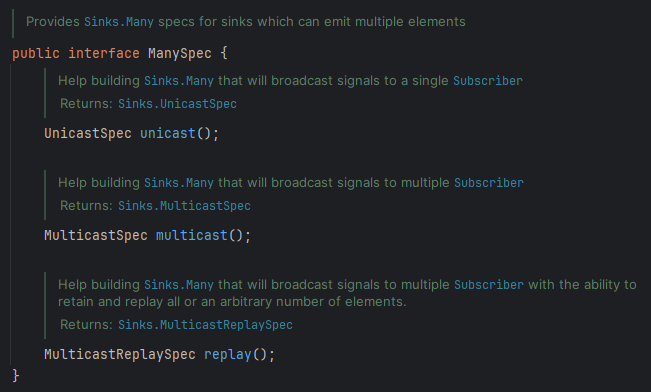 `Sinks.many()` 메서드의 경우, Sinks.Many를 리턴하는 것이 아닌 ManySpec이라는 인터페이스를 리턴하고 있는 것을 볼 수 있습니다.