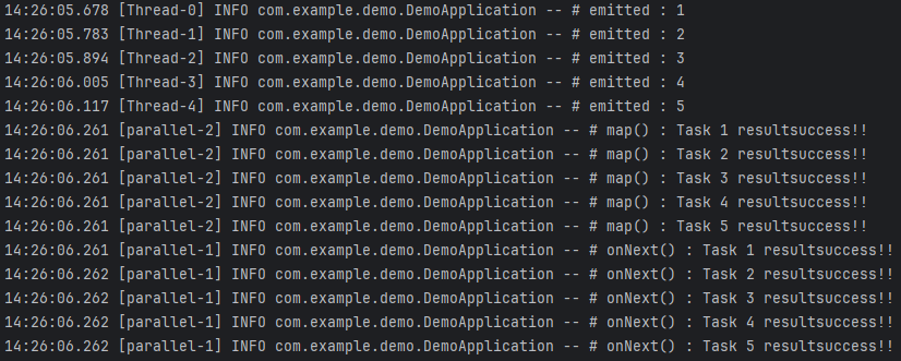 결과를 살펴보면, `doTask()` 메서드의 작업 처리는 boundedElastic-1 스레드에서, `map()`에서의 가공 처리는 parallel-2 스레드에서, Subscriber에서 전달받은 데이터 처리는 parallel-1 스레드에서 실행되는 것을 볼 수 있습니다.