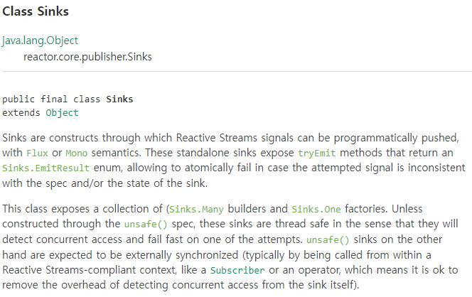 첫 문장을 보면, "Sinks는 리액티브 스트림즈의 Signal을 프로그래밍 방식으로 push 할 수 있는 구조이며, Flux or Mono의 의미 체계를 가진다" 라고 설명하고 있습니다.