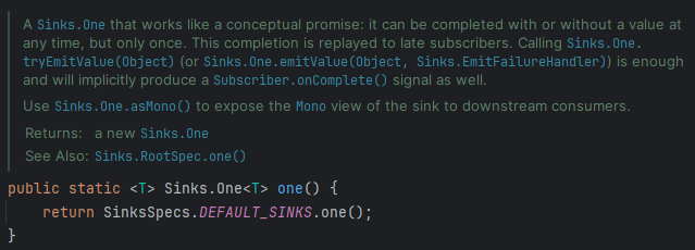 Sinks.One<String> sinkOne = Sinks.one();