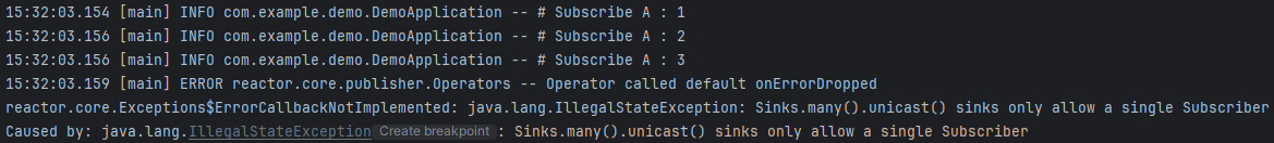 unicast() sinks는 단일 Subscriber에게만 허용된다고 친절하게 설명까지 해주네요.
