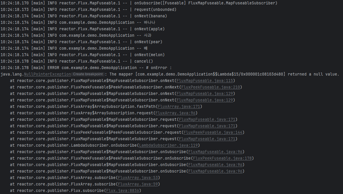 실행 결과에서 마지막으로 `cancel()` Signal이 출력되었습니다. 이는 두 번째 `map`이 “melon”이라는 문자열을 emit했지만, 이 이후에 처리하는 중에 에러가 발생했음을 의미합니다.