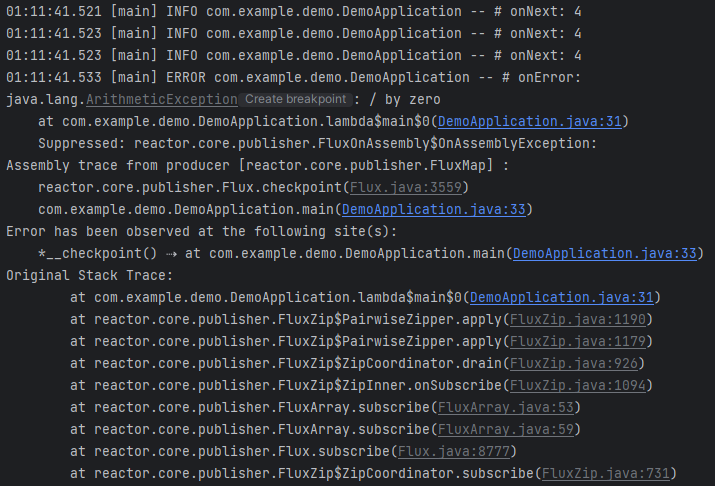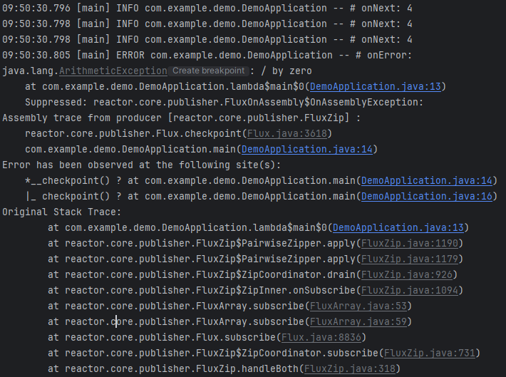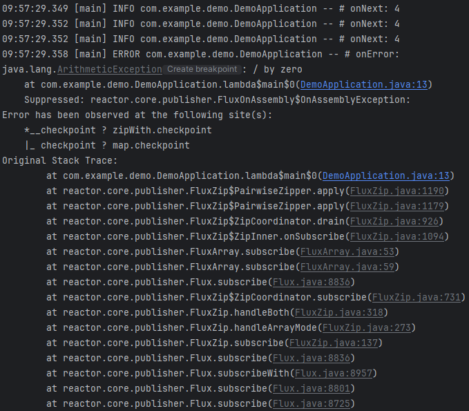 실행 결과를 확인해보면 두 `checkpoint()` 모두 Traceback이 출력된 것을 확인할 수 있습니다. 첫 번째 `checkpoint()` 는 `zipWith()` Operator에서 직접적으로 에러가 발생해 출력된 것이고, 두 번째 `checkpoint()` 는 에러가 전파되었기 때문에 출력된 것입니다.