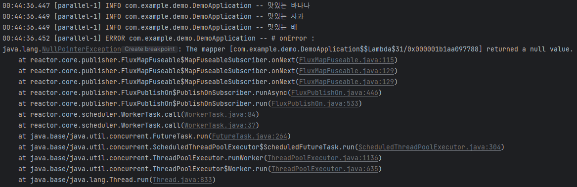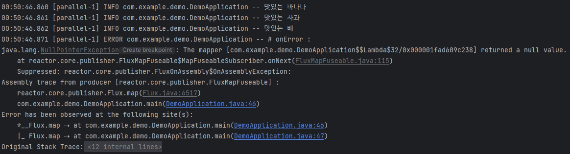 출력된 에러 메시지(NullPointerException) 이외의 stack trace에서는 의미 있는 내용을 확인하기가 어렵습니다. 에러 메시지를 확인해보면, `map()` Operator에서 NullPointerException이 발생한 것 같기는 하지만, 위 코드에는 `map()` 이 4 개나 있기 때문에 어떤 `map()` Operator에서 에러가 발생했는지 구체적으로 알기 힘듭니다.