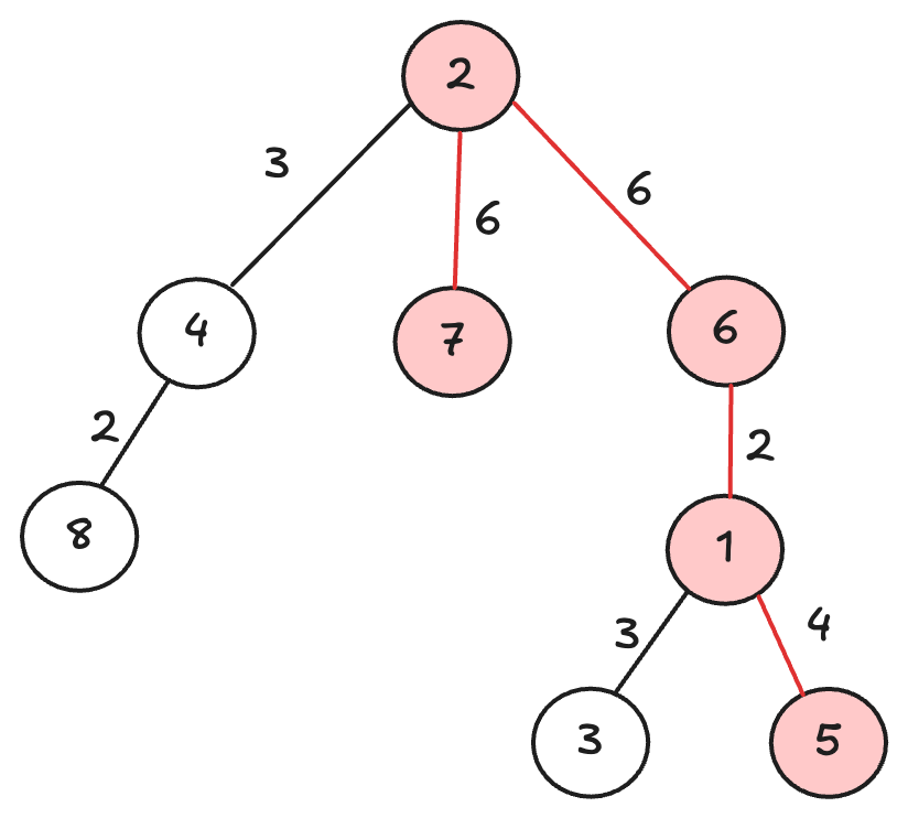 이제 7번 정점을 시작으로 가장 먼 정점을 구합니다. 가장 먼 정점은 5번 정점이 되며, 따라서 7번 정점과 5번 정점으로 이루어져 있는 경로의 길이가 트리의 지름이 됩니다.