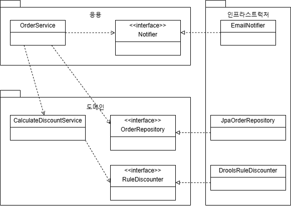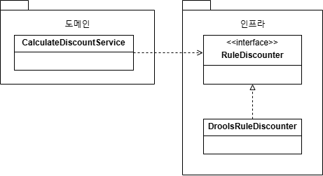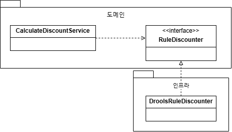 `CalculateDiscountService`입장에서는 '고객 정보와 구매 정보에 룰을 적용해 할인 금액을 구한다' 라는 것만 중요할 뿐, 룰 적용을 어떤 것을 이용했는지는 중요하지 않습니다.