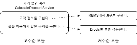 - "룰을 이용한 할인 금액 계산"은 고수준 모듈의 개념이기 때문에 `RuleDiscounter`는 다음과 같이 고수준 모듈에 해당합니다.
