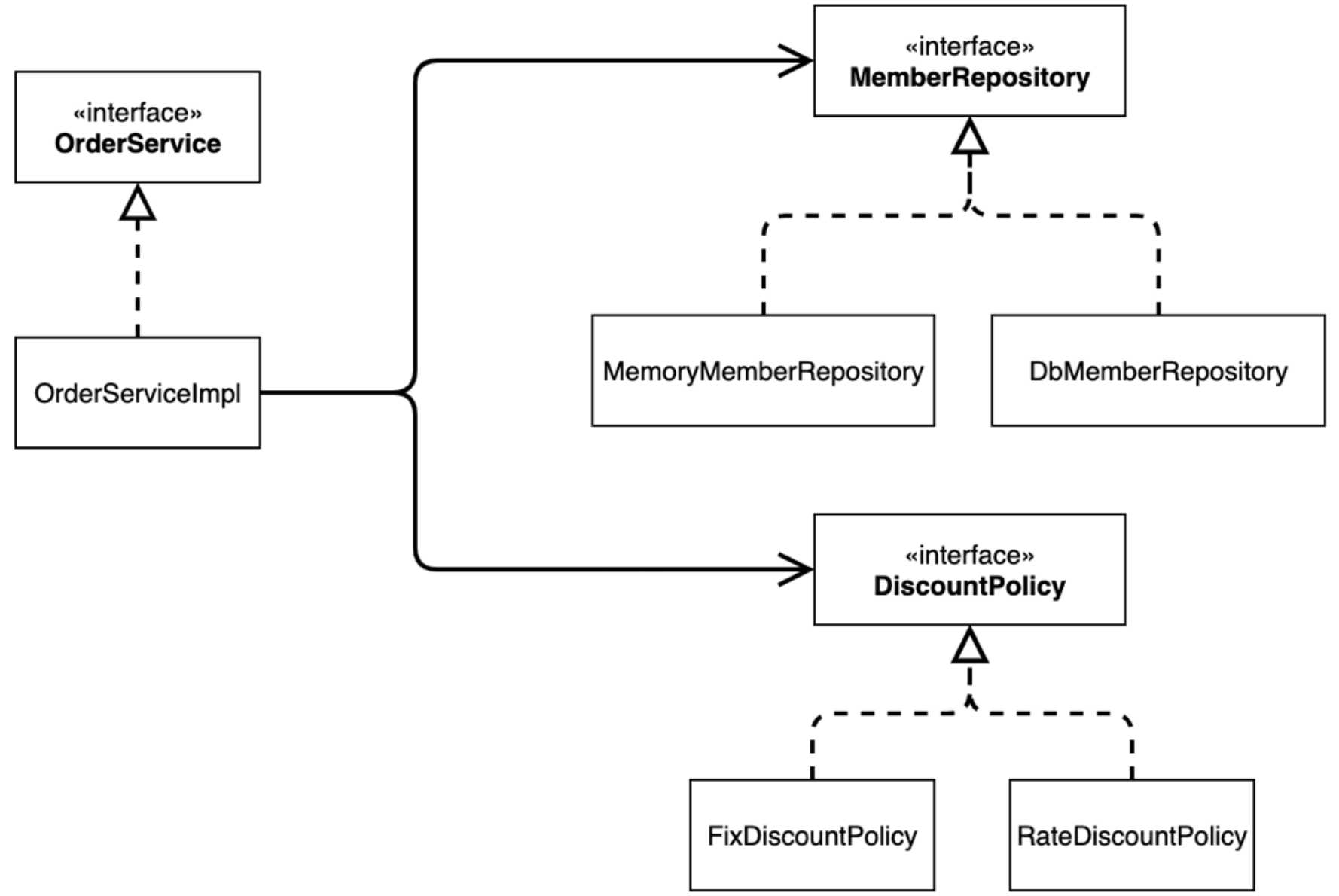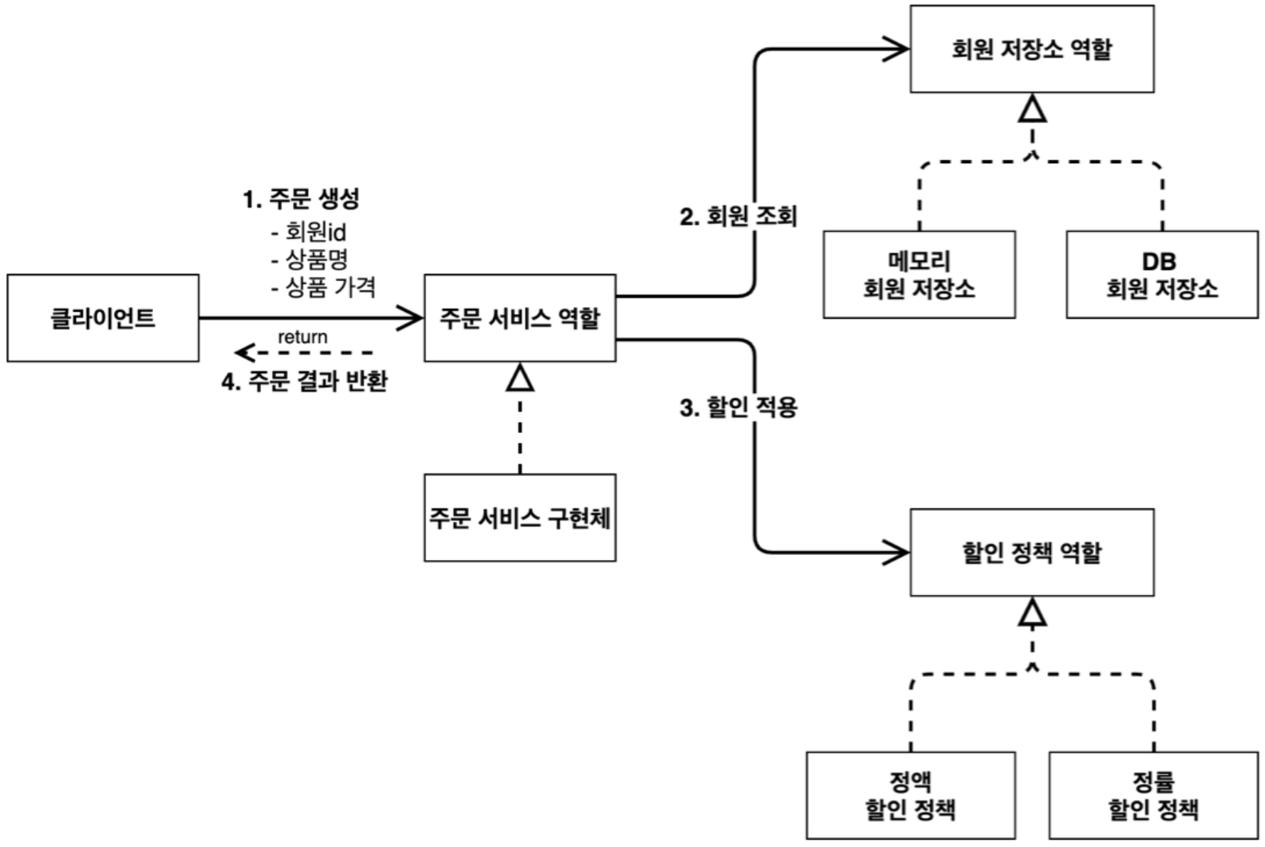 위 그림을 잘 보면 역할을 먼저 만든 뒤, 구현을 만들었다. 역할과 구현을 분리했기 때문에 자유롭게 구현 객체를 조립할 수 있게 설계되었다. 이 덕분에 회원 저장소뿐만 아니라, 할인 정책도 유연하게 변경할 수 있다.