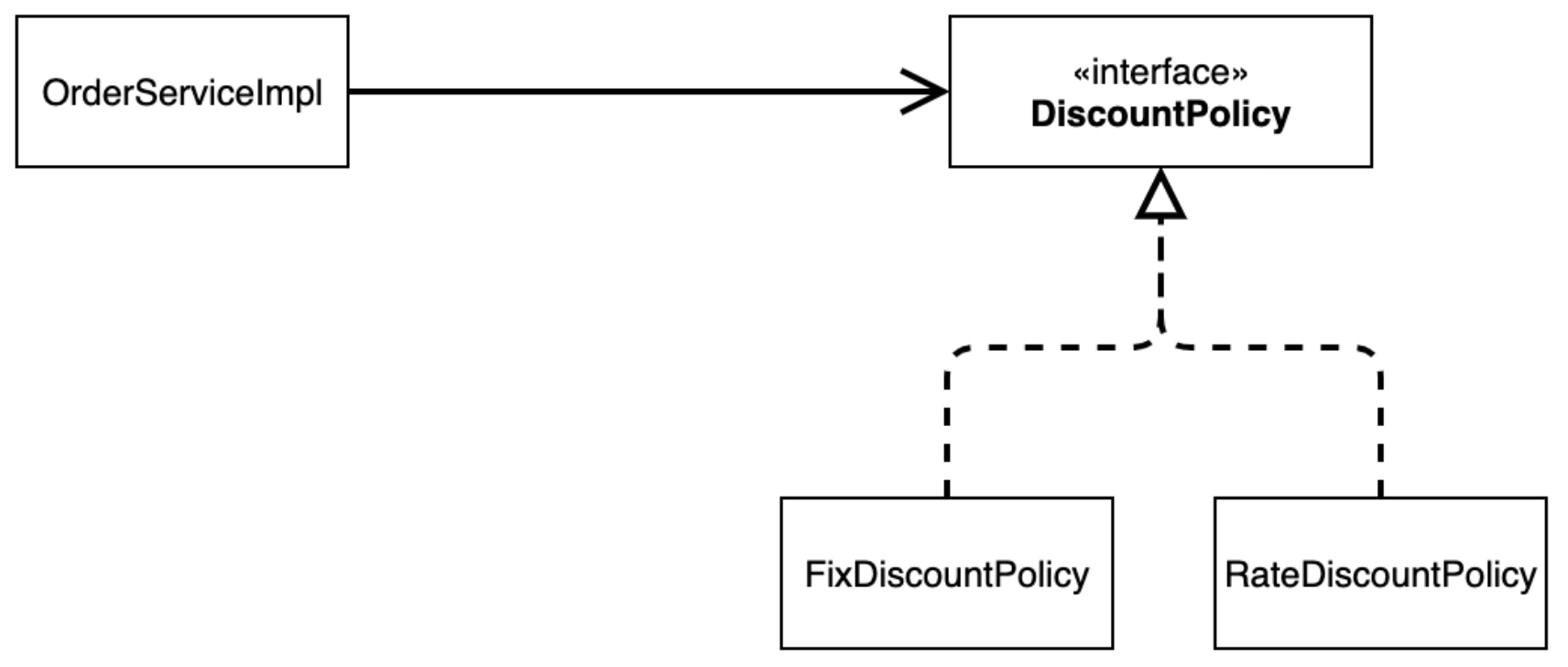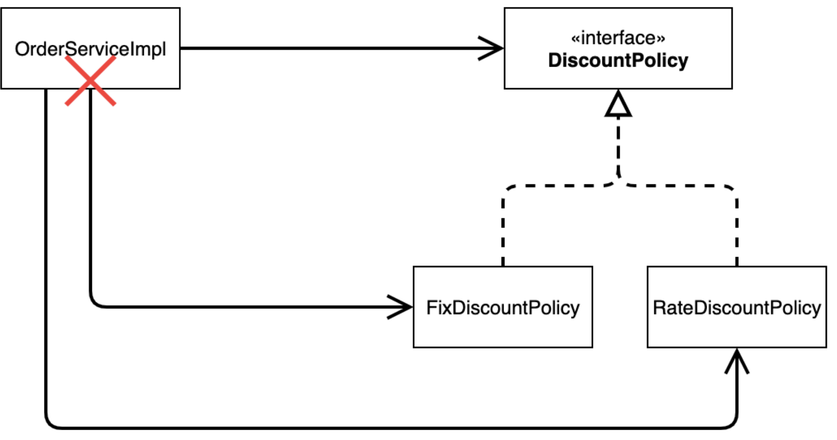 만약 여기서 정책을 변경한다면 OrderServiceImpl의 코드가 반드시 변경이 되어야 한다. 즉, 이러한 의존관계가 존재한다면 클라이언트 코드가 반드시 변경(영향)되는 것이다. 이는 OCP를 위반한 것이다.