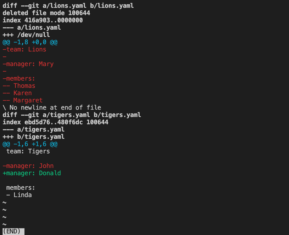 이전 포스팅에서의 lions.yaml 파일을 삭제하고, tigers.yaml 파일의 manager항목을 Donald로 변경하고, leopards.yaml 파일을 추가해보자. 그래서 git status를 이용해 상태를 확인해보면 다음을 확인할 수 있다.