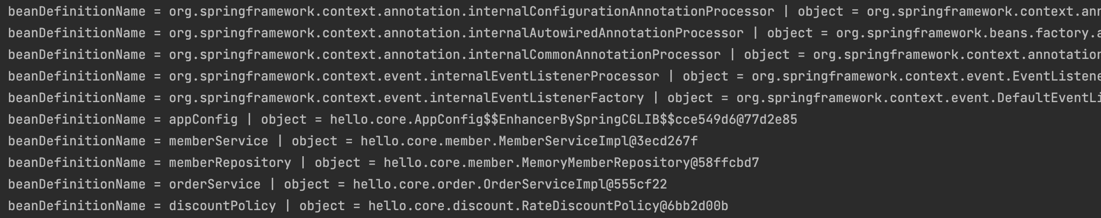 - 위의 첫 번째 코드(테스트 코드)를 실행하면 스프링에 등록된 모든 빈 정보를 출력할 수 있다.