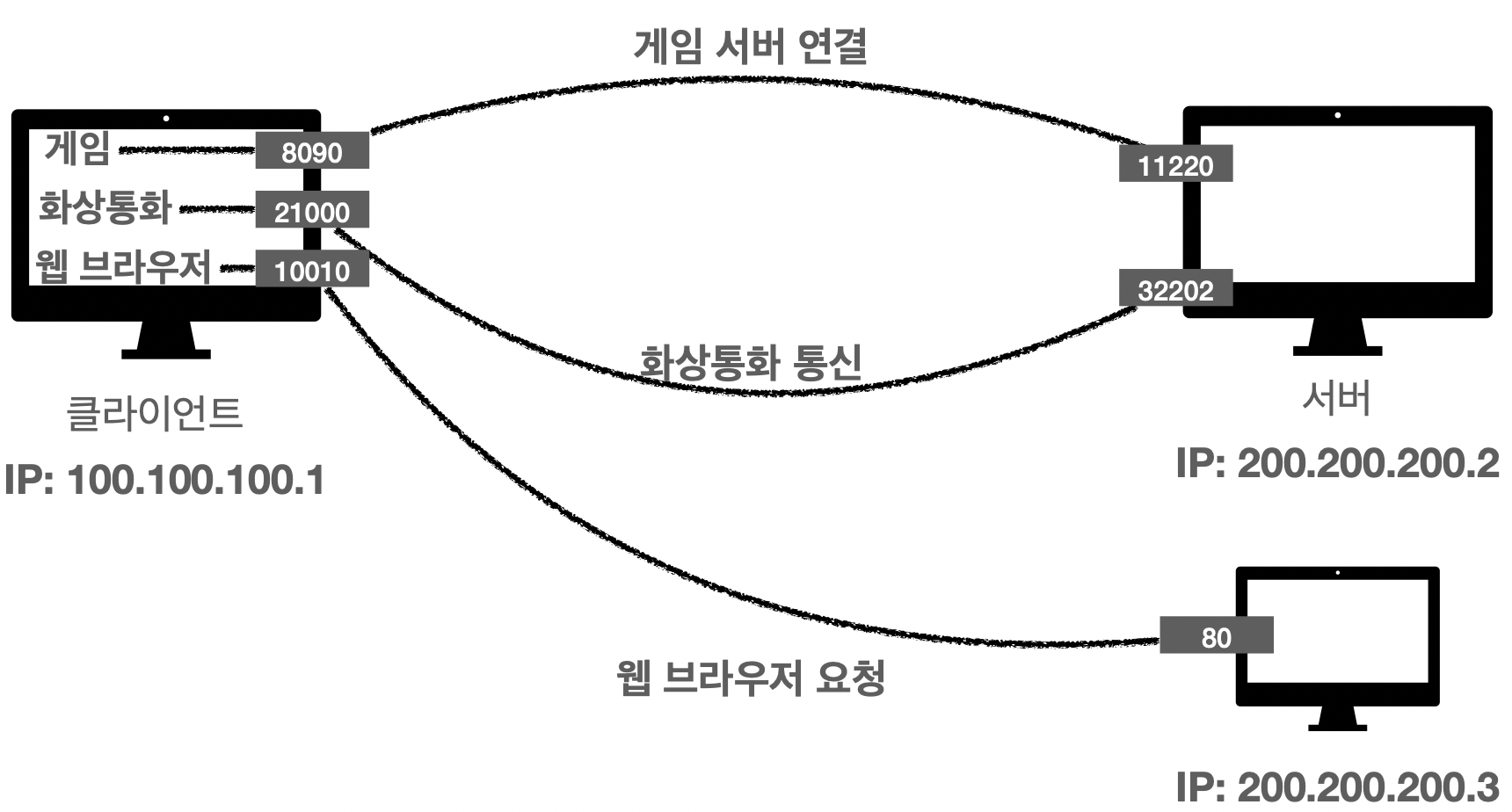 정리하면, Port는 같은 IP 내에서 프로세스를 구분하는 용도이고 아래와 같은 예시를 보일 수 있다.
