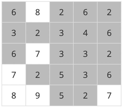 이제 위와 같은 지역에 많은 비가 내려서 높이가 4 이하인 모든 지점이 물에 잠겼다고 하자. 이 경우에 물에 잠기는 지점을 회색으로 표시하면 다음과 같다.