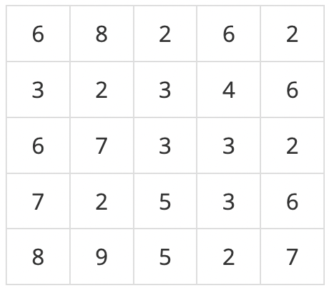 어떤 지역의 높이 정보는 행과 열의 크기가 각각 N인 2차원 배열 형태로 주어지며 배열의 각 원소는 해당 지점의 높이를 표시하는 자연수이다. 예를 들어, 다음은 N=5인 지역의 높이 정보이다.
