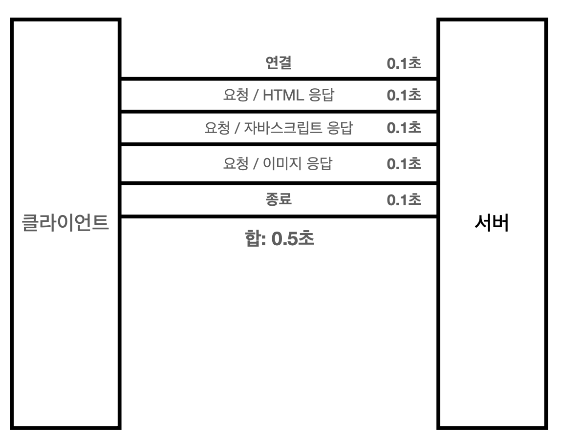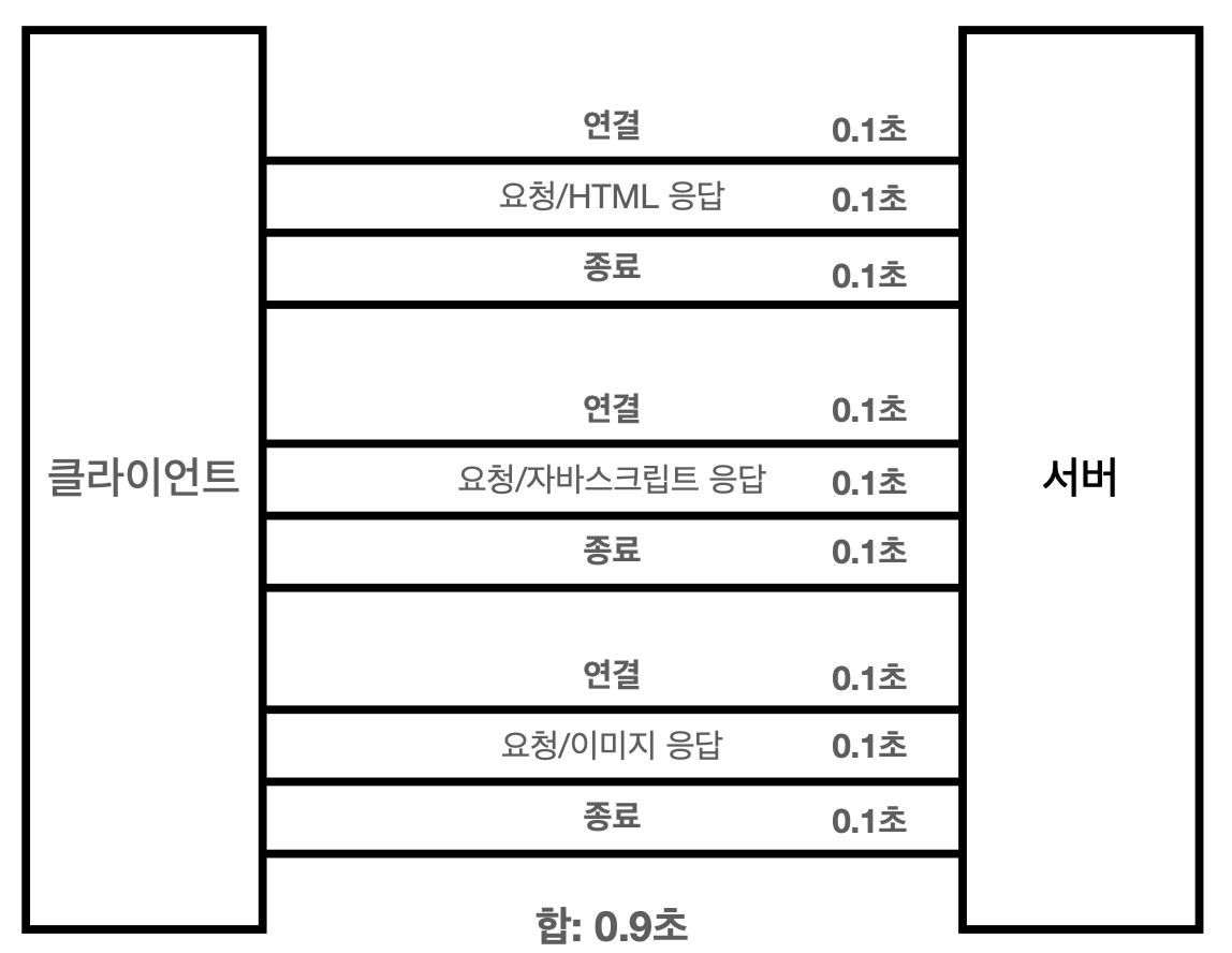 이 비연결성도 단점과 한계가 존재하는데, 매번 TCP/IP 연결을 새로 맺어야 한다는 것이다. 즉, 3-way handshaking이 매 연결마다 필요하다. 또한, 웹 브라우저로 사이트를 요청하면 HTML 뿐만 아니라 JavaScript, css, 추가 이미지 등 수많은 자원이 함께 다운로드된다.