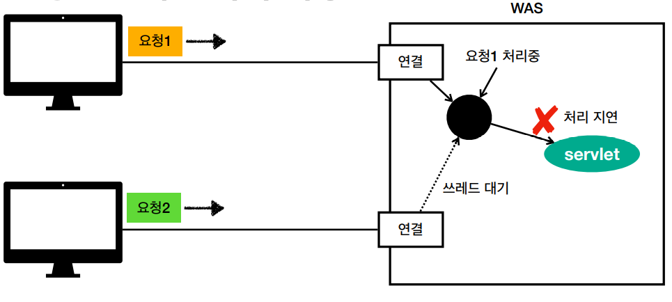 위 상황은 요청 1의 처리가 지연된 상태에서 요청 2가 들어온 상태이다. 이 경우 스레드가 1개밖에 없기 때문에 대기를 할 수밖에 없고 수행할 수 없게 된다. 결국에는 타임 아웃... 등의 이유로 오류가 발생할 것이다.