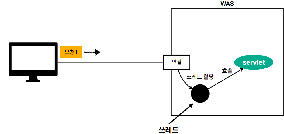 이렇게 클라이언트의 요청이 있으면 WAS(서버)는 요청에 대한 응답을 할 것이다. 이를 위해서는 먼저 TCP/IP 연결이 이루어지고 WAS는 서블릿을 호출한다. 이 서블릿 객체는 누가 호출할까? 바로 스레드가 호출한다.